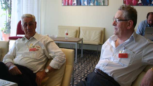 17.09.05. To veteraner i norsk sjakk med en pause under Landsturneringen i Sandnes.