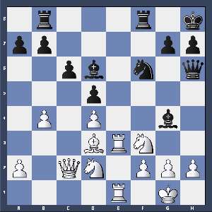 1.d4 f5 2.Sf3 Sf6 3.Lg5 e6 4.e3 d5 5.Ld3 Teorien sier 3.Sbd2, eller 3.c4 5...Le7 6.Lxf6 Lxf6 7.0–0 0–0 8.Sbd2 Sd7 9.c4 c6 10.Db3 Le7 11.cxd5 exd5 12.Tac1 Ld6 13.e4 fxe4 14.Sxe4 Lf4 15.Tce1 Kh8 16.Sed2 Df6 17.Dc2 Dh6 18.Te2 Sf6 19.Tfe1 Lg4 20.Te7 Tab8 21.b4? Hvits eneste mulighet er: [21.h3 Ld7 22.a3 og svart har ingen avgjørende vinstvariant] 21...Ld6 22.T7e3